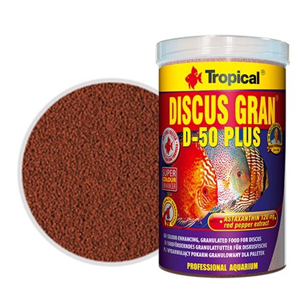 TROPICAL D-50 plus je visoko proteinska hrana u listićima za diskuse i ostale ribe sa velikim potrebama hranjivim materijalom. Prirodni stimulator imuniteta BETA 1.3/1.6 GLUCAN efikasno podržava i ojačava imuni sistem a astaxantin i beta-karotin izuzetno pojačavaju živost i intezitet boja riba.