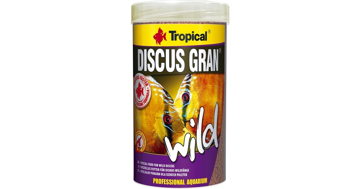 TROPICAL DISCUS GRAN WILD je hrana u obliku sporo tonućih granula, koja sadrži široku paletu hranjivih sastojaka, sa dodatkom algi, krilla i voća. Namijenjena je za svakodnevnu prehranu divljih i uzgojenih diskusa i drugih zahtevnih vrsta riba. Zahvaljujući nežnoj teksturi, granule omekšaju u vodi vrlo brzo te ih zato divlje ribe odlično prihvataju. Sadrže sledeće alge: spirulina (Arthrospira platensis), chlorella (Chlorella vulgaris) i Ascophyllum nodosum i Laminaria digitata (kelp alga). Nezasićene masne kiseline, proteini (bogati esencijalnim amino kiselinama) i vitamini iz spiruline i chlorella alge u kombinaciji sa makronutrijentima i elementima u tragovima iz kelp algi (uključujući jod, hrom, selen i gvožđe) osiguravaju izvrsno stanje, intenzivan rast i vitalnost kod riba. Velik udeo sastojaka biljnog porekla, uključujući alge I voće, čini ovu hranu sličnom prehrani diskusa u divljini. Redovno hranjenje sa TROPICAL DISCUS GRAN WILD osiguravate Vašim ribama visoke doze hlorofila - zeleni pigment koji dolazi iz Chlorella, što je kontrovani izvor hlorofila. Hlorofil koči razvoj nepoželjnih bakterija u probavnom traktu, sprečava infekcije i zajedno sa zeolitom povećava oslobađanje toksina iz tela ribe. Aktivne materije beli luk i spirulina jačaju imunitet, pomažući na taj način ribama u borbi protiv patogena. Karotenoidi iz krilla i crvene paprike uz ostale izvore i dodatak astaxanthina, utiču na prirodno bojenje riba i spriječava blijede boje.
