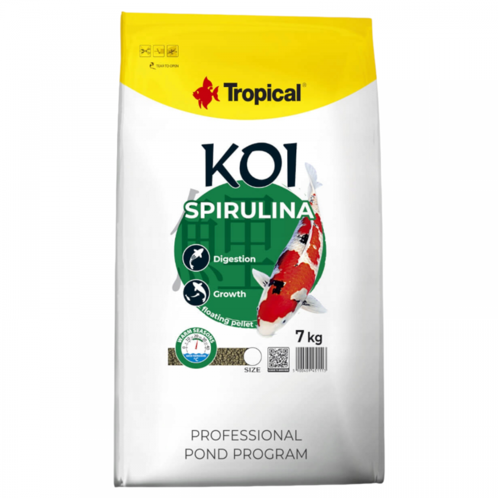 Tropical Koi Spirulina je hrana u obliku peleta koja tone. Koristi se za svakodnevnu ishranu Koi šarana kbogata kvalitetnim proteinima koji ubrzavaju rast ribe i pomažu u razvoju sjajnog oblika tela i poboljšanju kondicije ribe. Pojačava prirodnu boju riba.